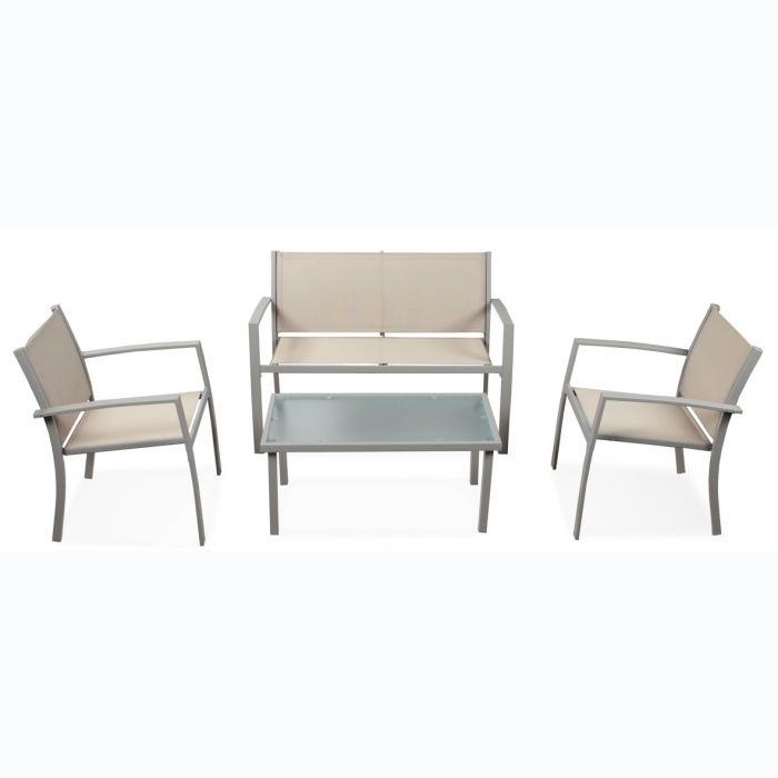 SET TAVOLINO + 2 SEDIE + DIVANETTO ACCIAO E TEXTILENE BEIGE