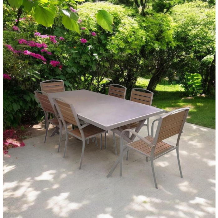 SET TAVOLO + 6 SEDIE DA ESTERNO IN ALLUMINIO TORTORA E PVC EFFETTO LEGNO NATURALE