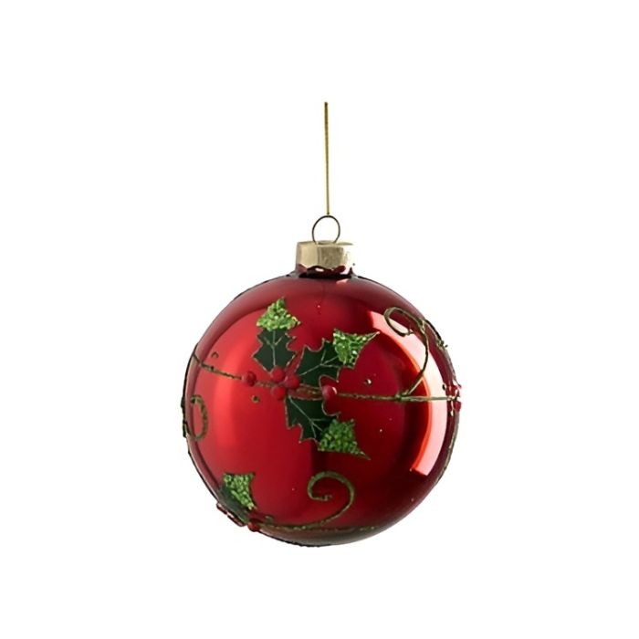 SFERA DI VETRO DIAM. 10CM ROSSA CON AGRIFOGLIO VERDE