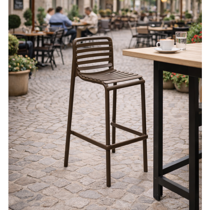 Sgabello monoblocco per interno DOGA STOOL di Nardi®, realizzato in polipropilene fiberglass trattato anti‑UV colore tabacco con finitura opaca, caratterizzato da un design fresco e leggero ispirato al tema della doga e da una seduta sinuosa a S che valorizza la silhouette arrotondata, funzionale e pensato per completare la collezione Doga; dimensioni 51×49,5 h. 100 cm con altezza seduta 75 cm, peso 5,1 kg, impilabile, dotata di piedini antiscivolo, testato a norma da Catas e fornito montato.