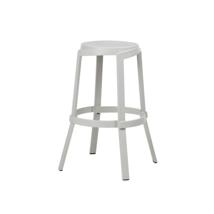 Sgabello alto monoblocco da esterno STACK MAXI di Nardi®, realizzato in polipropilene fiberglass rigenerato trattato anti‑UV colore gesso con finitura opaca, dal design lineare con sezioni ad alto spessore ispirate ai fasci lignei; la particolare mescola blend crea volute striature uniformate e una texture opacizzata a effetto vintage; dimensioni Ø 48 × h 76,5 cm, peso 4,4 kg, impilabile, dotato di piedini antiscivolo, sottoposto a test LCA e testato da Catas, fornito montato.