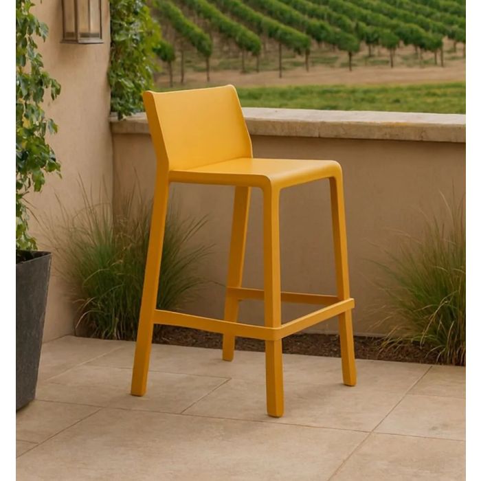 Sgabello per interno TRILL STOOL MINI di Nardi®, realizzato in polipropilene fiberglass trattato anti‑UV colore senape con finitura opaca, caratterizzato da un design essenziale, slanciato e confortevole, ideale per accompagnare tavoli alti e banconi di bar o cucine, leggero e semplice da mantenere; dimensioni 47×52,5 h. 85 cm con altezza seduta 65 cm, peso 4,6 kg, impilabile, dotata di piedini antiscivolo, testato a norma da Catas e fornito montato.