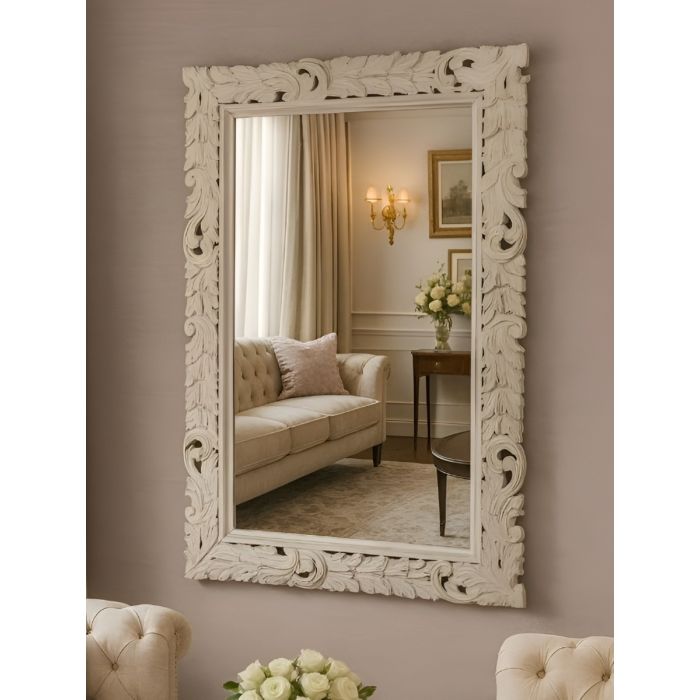 SPECCHIO RETTANGOLARE CM 70X100 IN LEGNO CON CORNICE INTAGLIATA BIANCA