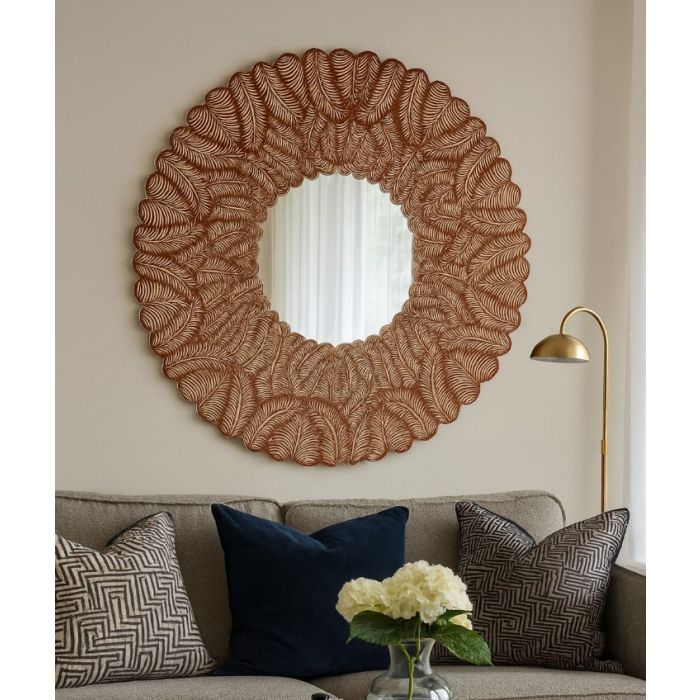 SPECCHIO ROTONDO DIAM. 120CM IN LEGNO INTAGLIATO EFFETTO FOGLIA MARRONE CHIARO