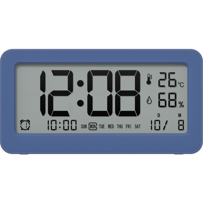 Sveglia al quarzo digitale con luce elettroluminescente bianca a spegnimento ritardato e snooze (ripetizione dopo 5 minuti). Calendario (giorno, mese, e giorno della settimana). Doppio allarme. Rilevazione della temperatura e dell’umidità interne.
