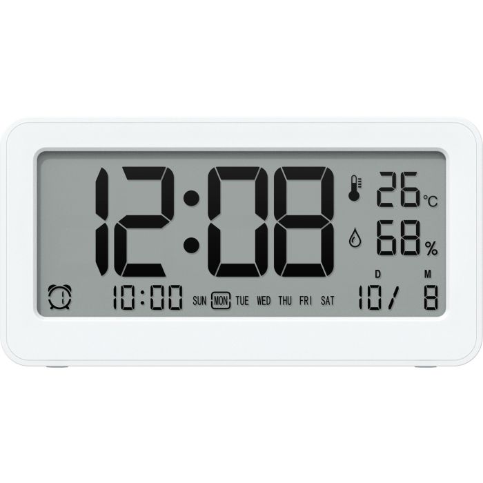 Sveglia al quarzo digitale con luce elettroluminescente bianca a spegnimento ritardato e snooze (ripetizione dopo 5 minuti). Calendario (giorno, mese, e giorno della settimana). Doppio allarme. Rilevazione della temperatura e dell’umidità interne.