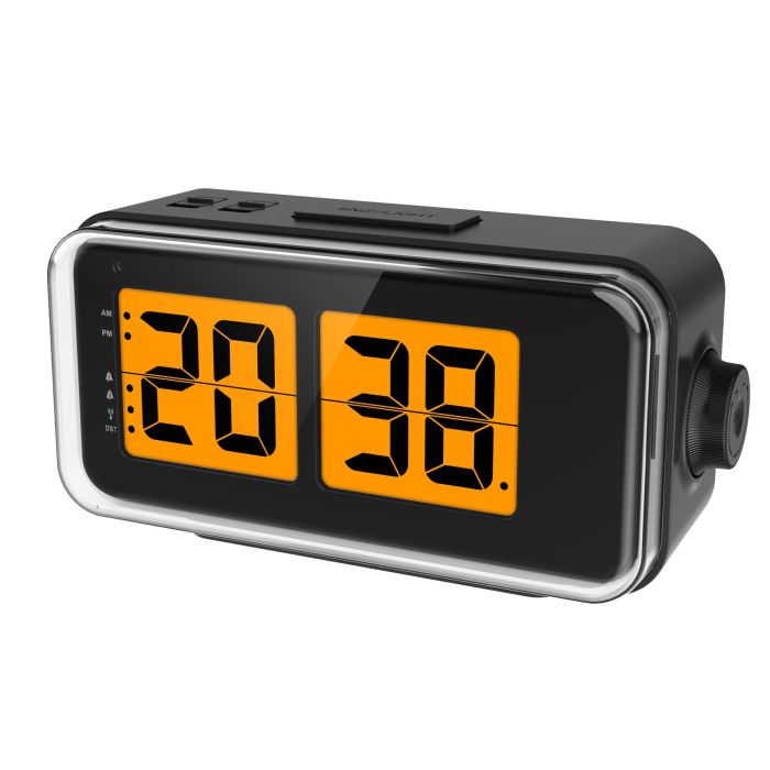 Sveglia radiocontrollata (DCF) con cartelle digitali. Possibilità di effettuare la messa a punto manuale. Doppio allarme con Snooze. Calendario (Giorno, Mese, Anno). Luce elettroluminescente a spegnimento ritardato. Possibilità di visualizzare la temperatura interna attivando loop alternato di orario, calendario e temperatura. Sensore crepuscolare che consente illuminazione automatica display in presenza di buio (disattivabile). Possibilità di applicazione a parete. Pulsante/rotella laterale per messa a punto.