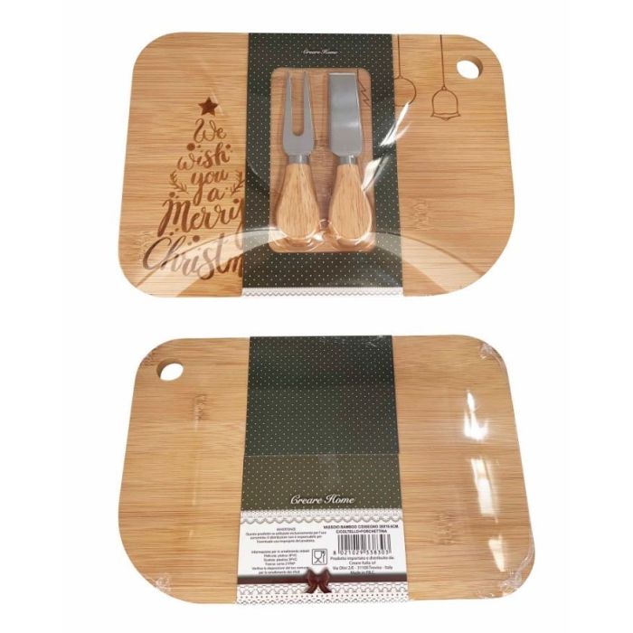 | Note | - Tagliere in bamboo naturale - Arricchito con coltello e forchettina - Con angoli smussati - Impreziosito da scritta natalizia - Con foro per appenderlo - Lavaggio con acqua e sapone e asciugarlo rapidamente - Non lasciare in ammollo e non mettere in lavastoviglie - Farlo asciugare in verticale in luogo areato |