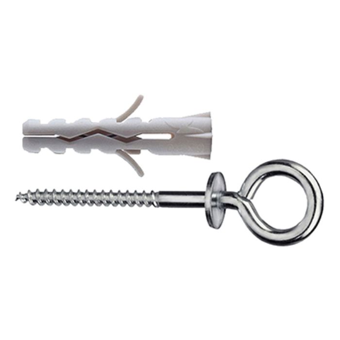 Tasselli in nylon Ø 6 x 30 mm senza collarino con occhiolo chiuso, confezione da 12 pz, indicati per fissaggi leggeri su calcestruzzo, laterizi pieni e semipieni; dotati di alette anti-rotazione e profilo sagomato per garantire un ottimo ancoraggio, forniti con occhiolo chiuso filettato per legno che consente un fissaggio non passante, ideali da utilizzare come punto di ancoraggio per corde, catene, ganci, accessori e fili per biancheria.