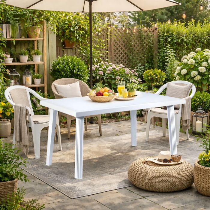 Il tavolo da esterno mod. DOMINGO, realizzato in plastica colore bianco, misura 130 x 75 x 72 cm e viene fornito smontato, offrendo una soluzione leggera, resistente e di facile manutenzione ideale per arredare con semplicità giardini, terrazze e spazi all’aperto.