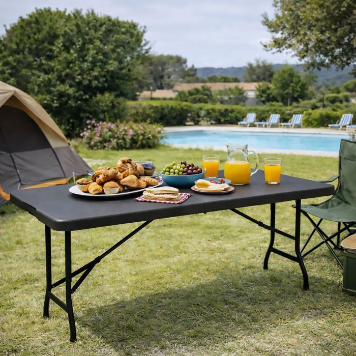 Il tavolo rettangolare presenta struttura in metallo colore antracite, piano in plastica colore grigio con spessore 4,3 cm, è richiudibile, misura da aperto 180 × 75 × h 74 cm e da chiuso 89 × 9 × h 74 cm; il prodotto viene fornito montato, offrendo una soluzione pratica e resistente per uso domestico o professionale.