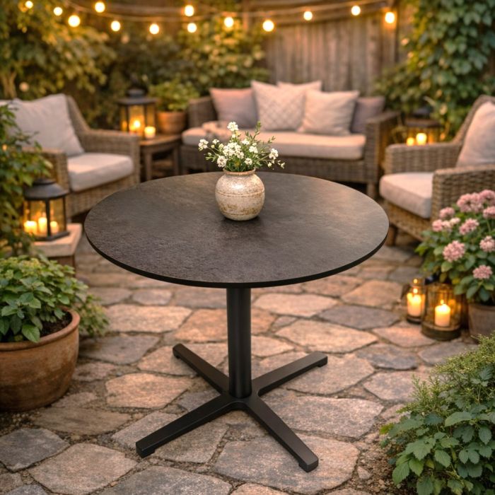 Tavolo rotondo da esterno con struttura in alluminio verniciato antracite e piano in HPL antracite, progettato per garantire resistenza e praticità negli spazi outdoor; presenta un diametro di 70 cm con altezza 72 cm e viene fornito smontato, pronto per un montaggio semplice e veloce.
