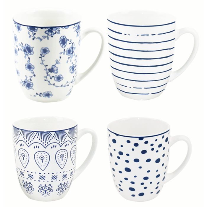 Tazza mug MALCESINE in porcellana da 330ml, interno bianco ed esterno decorato con il decoro "Pad Printing" in fantasie assortite esclusivamente in tonalità blu; peso 350 g; pratica e resistente, è lavabile in lavastoviglie e adatta al microonde; disponibile in assortimento ma venduta esclusivamente come pezzo singolo.