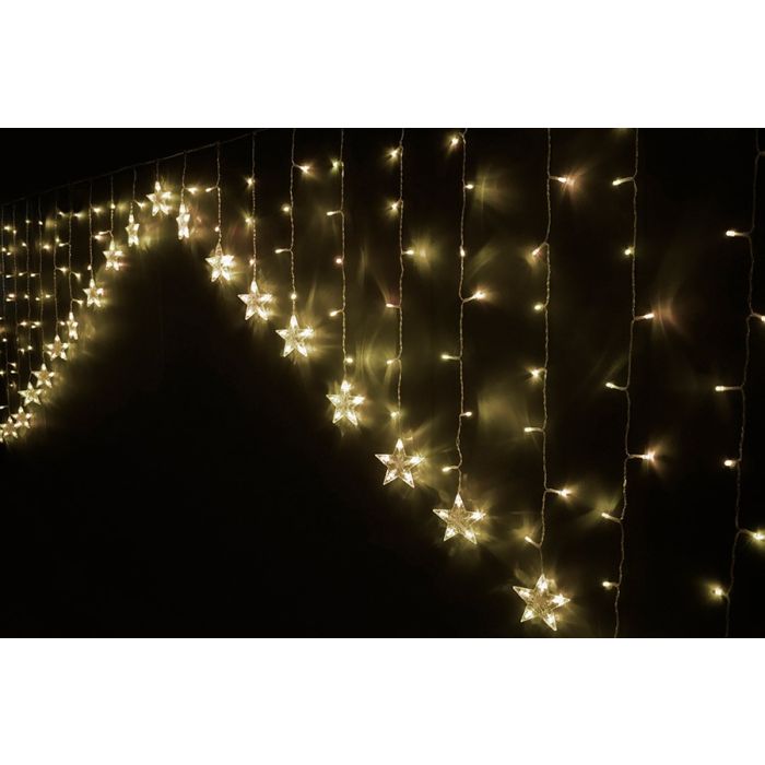 Tenda luminosa per esterni misura 3x1,2m con 215 LED a luce bianco caldo in modalità flash, ideale per decorare facciate, pergole e vetrine natalizie; dotata di cavo di alimentazione da 5m e trasformatore con presa Schuko tipo F, garantisce un collegamento sicuro. La tenda è prolungabile fino a 5 unità in serie tramite connettore a vite, permettendo installazioni modulari di grande impatto visivo mantenendo facilità di montaggio e resistenza alle condizioni esterne.