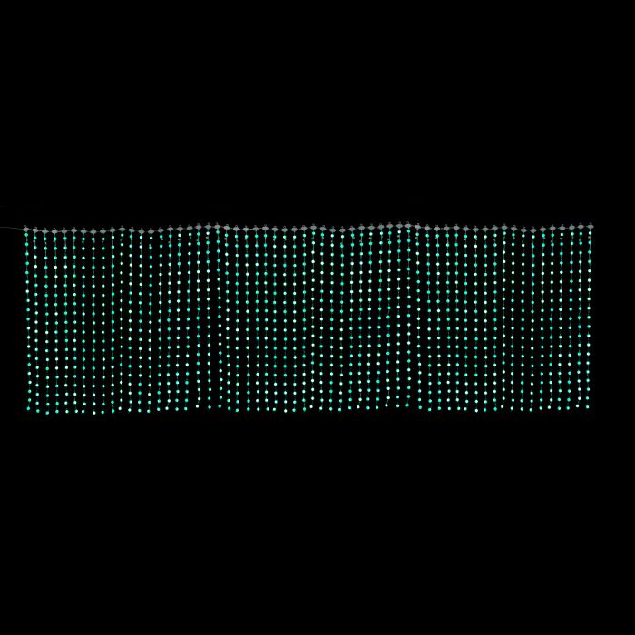 Tenda luminosa Smart 1200 LED multicolore, misura 3 × 1 m, composta da 60 linee da 20 LED con distanza di 5 cm; filo in rame rivestito in PVC, cavo di alimentazione da 5mt, munita di trasformatore IP44 e telecomando, pensata per uso esterno.