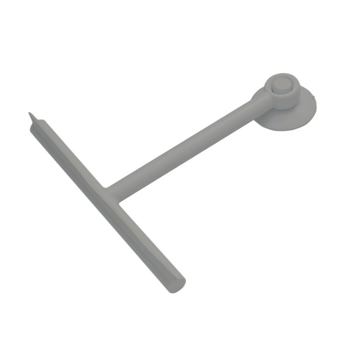 Il tergivetro mod. GUMMY in resine termoplastiche colore tortora chiaro, dimensioni 22×3 h. 23cm, con fissaggio a muro tramite ventosa (solo su superfici lisce come specchi e piastrelle); compatto, leggero e maneggevole, offre una soluzione pratica per rimuovere acqua e aloni senza forare le pareti, facile da installare, riposizionare e conservare.