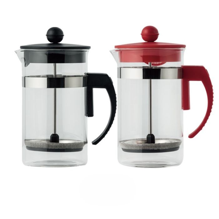 Tisaniera in vetro da 600 ml con filtro in acciaio inox e manico e coperchio in plastica colorata, disponibile nei colori rosso e nero, trasparente per osservare l'infusione e facile da pulire.