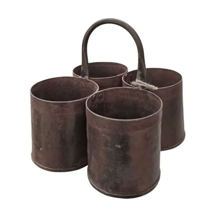 - Con 4 cilindri metallici saldati tra loro - Con manico ad arco - Superficie ossidata con sfumature rugginose - Perfetto per ambienti rustici e vintage è ideale per contenere vasi di fiori, candele, posate o semplicemente come decorazione a completare un arredamento in stile country, shabby chic o industriale. |