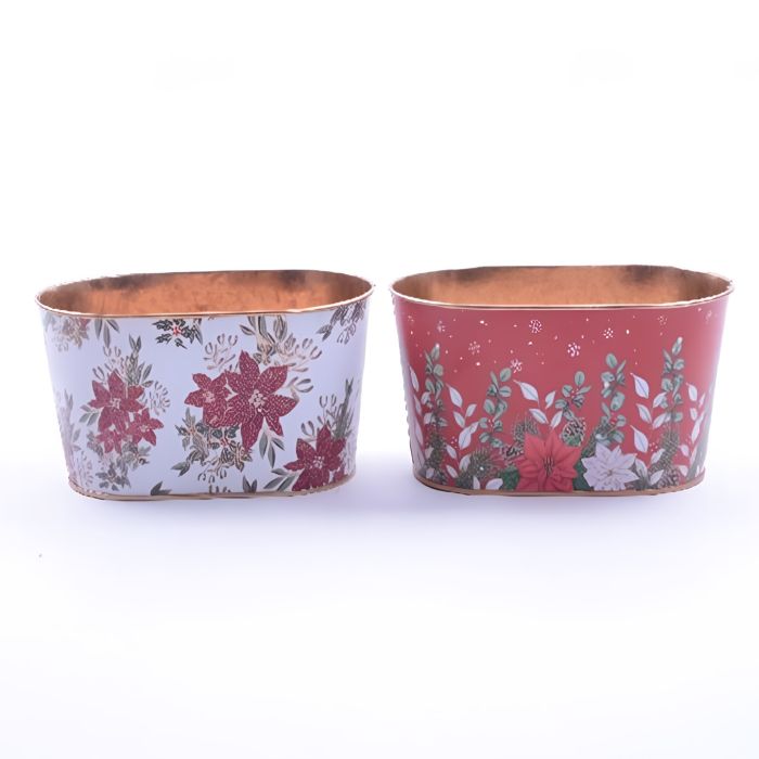 VASO OBLUNGO IN LATTA CON DECORO STELLA DI NATALE 19X11.5 H. 9CM ASSORTITO