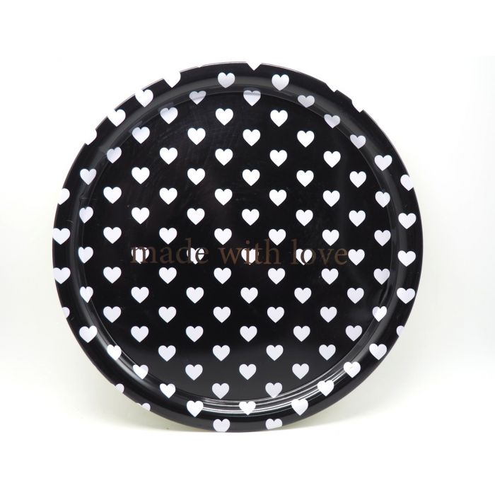 VASSOIO ROTONDO IN LATTA NERO CON CUORI BIANCHI H 1,8XD 40CM
