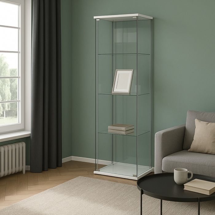 La vetrina è dotata di un'anta in vetro temperato, consentendo una visione chiara e protetta del contenuto. La struttura interna presenta 3 ripiani fissi in vetro, ognuno con una misura pari a 38,2x28,5cm, con uno spessore di 5mm. Ogni ripiano ha una portata massima di 7kg e lo spazio tra un ripiano e l'altro è di 38 cm, permettendo l'esposizione anche di oggetti di medie dimensioni.